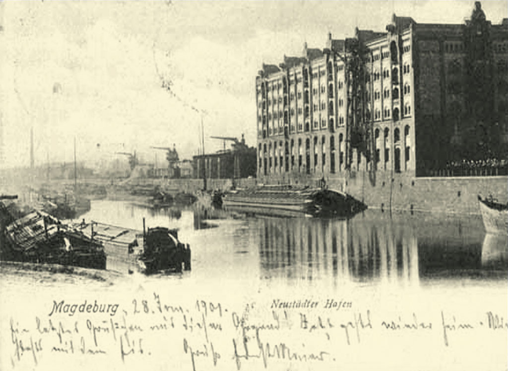 ... eine vergilbte Postkarte. Sie zeigt ein Motorschiff, auf dessen Deck Fässer lagern. Auch Marinetransporter und Schleppkähne sind zu sehen. Sie liegen am Kai des Magdeburger Hafens. Dicht an dicht. Im Hintergrund pusten riesige Schlote dicken Rauch in die Luft. Vor großen Backsteingebäuden, Hallen und Speichern wuseln Hafenarbeiter umher. Sie schleppen Kisten, stapeln Holz oder rollen Fässer. Die Elbe fließt ruhig durch das Motiv. Eine Momentaufnahme, entstanden vor mehr als hundert Jahren. Sie zeigt Magdeburg als wichtigen Warenumschlagplatz der damaligen Zeit, der Handelshafen an der Elbe ist ein zentraler Punkt.